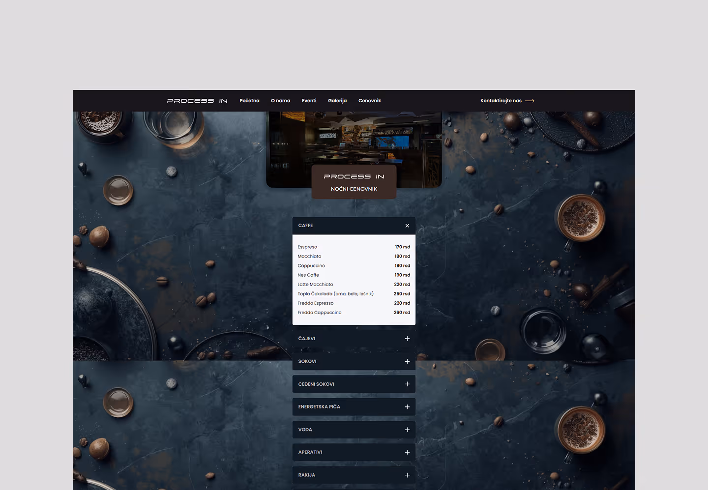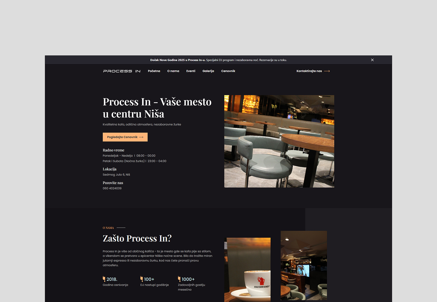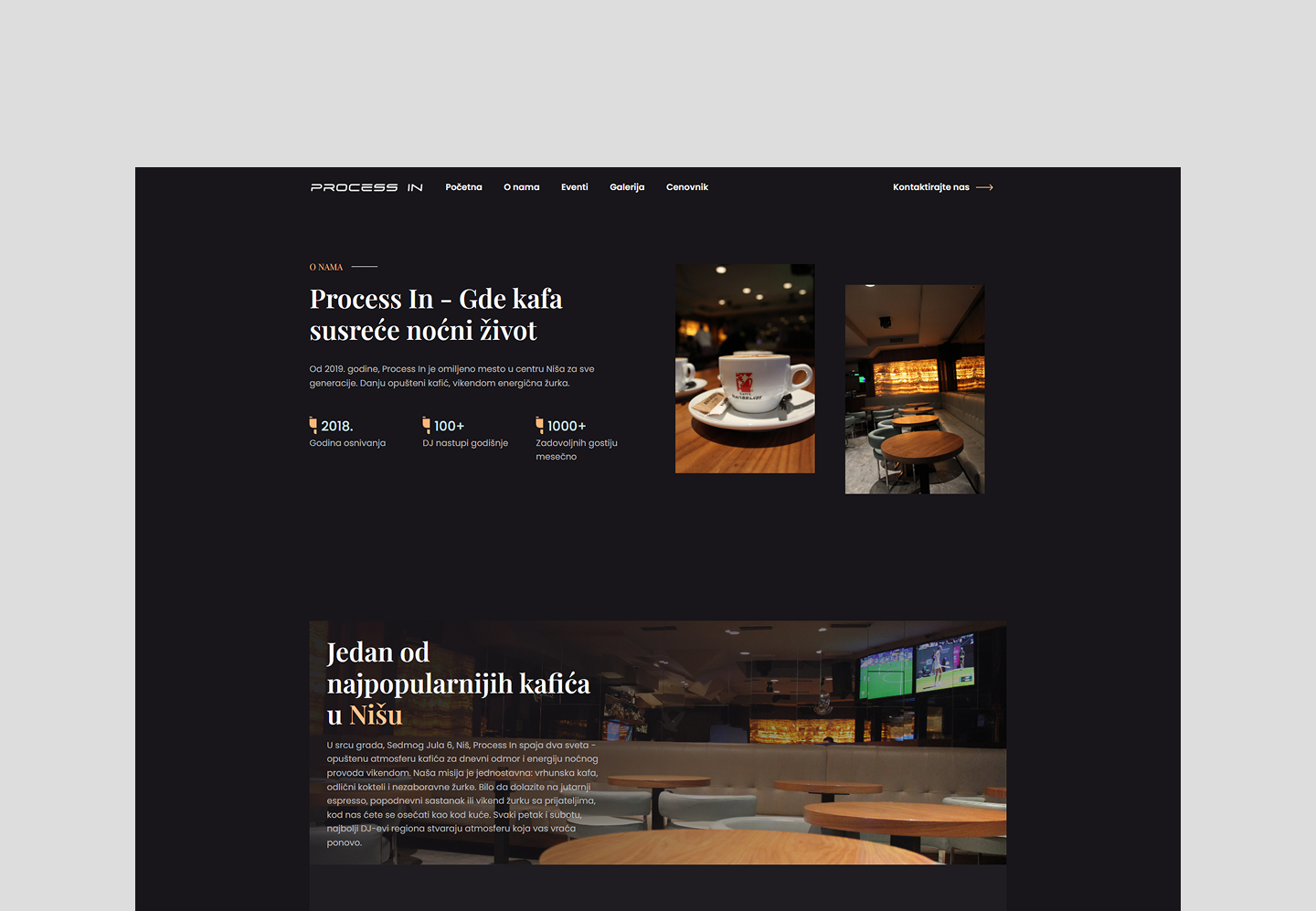 Dizajn sajta ističe jedinstvenu atmosferu Process In Bara, kvalitet ponude i energiju prostora. Korišćeni su vizuelni elementi koji prenose osećaj ambijenta - od dnevne kafe do noćnih događaja — čime se stvara snažan i autentičan prvi utisak kod posetilaca. - Razvoj funkcionalnog i preglednog web sajta